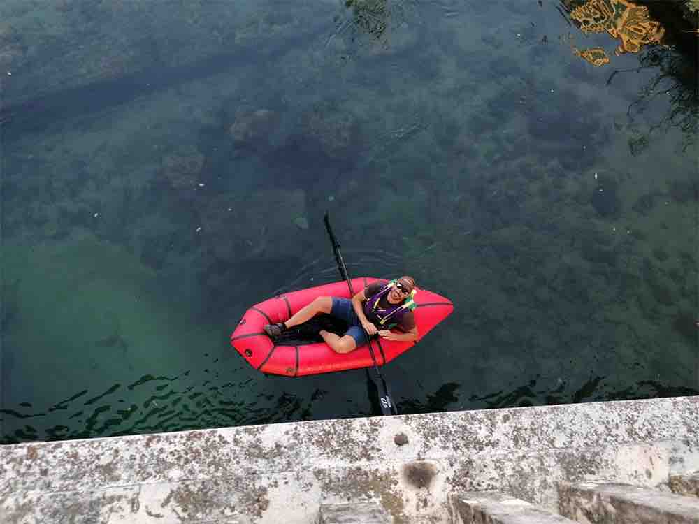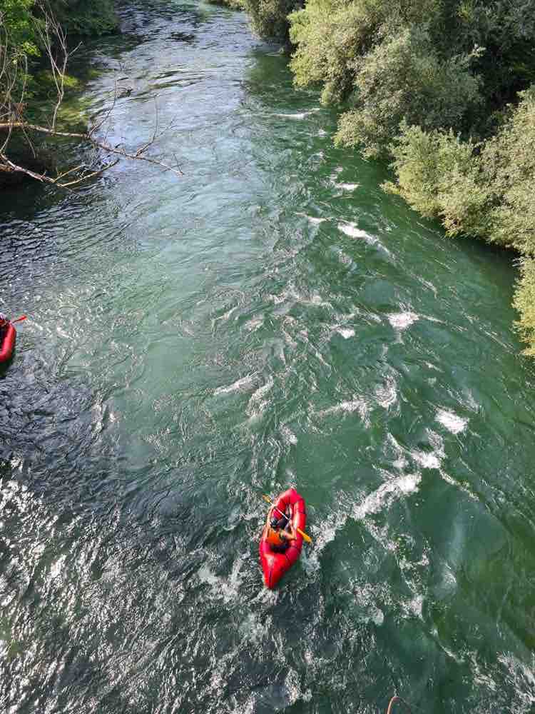 Dapprima un tratto di acqua calma per prendere confidenza con il packraft poi l’ingresso in corrente